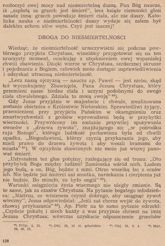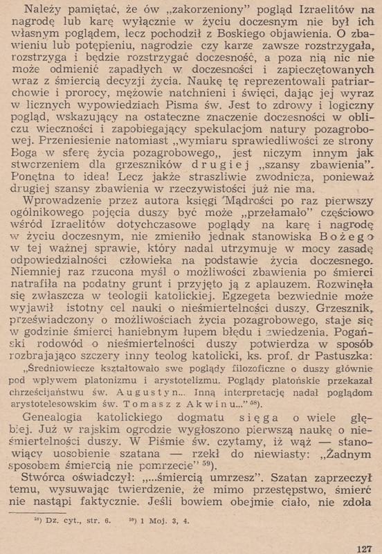 "Napisane jest też: „kto przekracza Prawo Mojżeszowe, ponosi śmierć” (Hbr 10:28), ale też: „ileż surowszej kary stanie się winien ten, kto by podeptał Syna Bożego (...) i obelżywie zachował się wobec Ducha łaski” Hbr 10:29. Słowo „śmierć”, (...) w NT często oznacza się brak wspólnoty z Bogiem: „Lecz ta, która żyje rozpustnie, za życia umarła” (1Tm 5:6), „Dlatego nawet umarłym głoszono Ewangelię” (1P 4:6), „masz imię, które mówi, że żyjesz a jesteś umarły” Ap 3:1. Wspólnotę tę mamy przez Chrystusa, co obrazuje cały Rz 6:23, „Albowiem zapłatą za grzech jest śmierć, a łaska przez Boga dana to życie wieczne w Chrystusie...”. Gdyby śmierć była końcem egzystencji, to jak Jezus mógłby uczyć: „Tam będzie płacz i zgrzytanie zębów, gdy ujrzycie Abrahama (...) w Królestwie Bożym, a siebie precz wyrzuconych” Łk 13:28. Widać więc, że będący w piekle mają widzieć swój stan potępienia i to, co utracili." (Włodzimierz Bednarski W obronie wiary, wyd.2015, str.445-446)