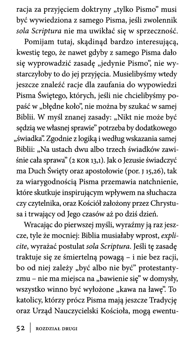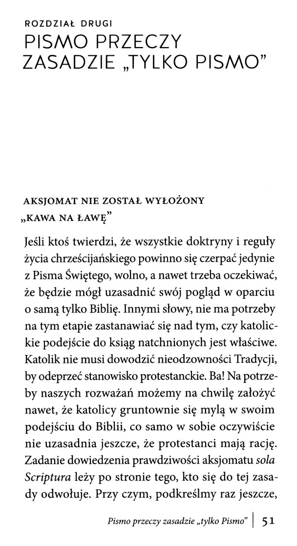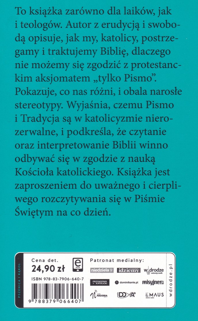 "To książka zarówno dla laików, jak i teologów. Autor z erudycją i swobodą opisuje, jak my, katolicy, postrzegamy i traktujemy Biblię. Wyjaśnia, dlaczego nie możemy się zgodzić z protestanckim aksjomatem „tylko Pismo”. Pokazuje, co nas różni i obala narosłe stereotypy. Podkreśla także, czemu Pismo i Tradycja są w katolicyzmie nierozerwalne, tzn. dlaczego tak ważne jest czytanie oraz interpretowanie Biblii w zgodzie z nauką Kościoła katolickiego. Książka jest zaproszeniem do uważnego i cierpliwego rozczytywania się w Piśmie Świętym na co dzień.