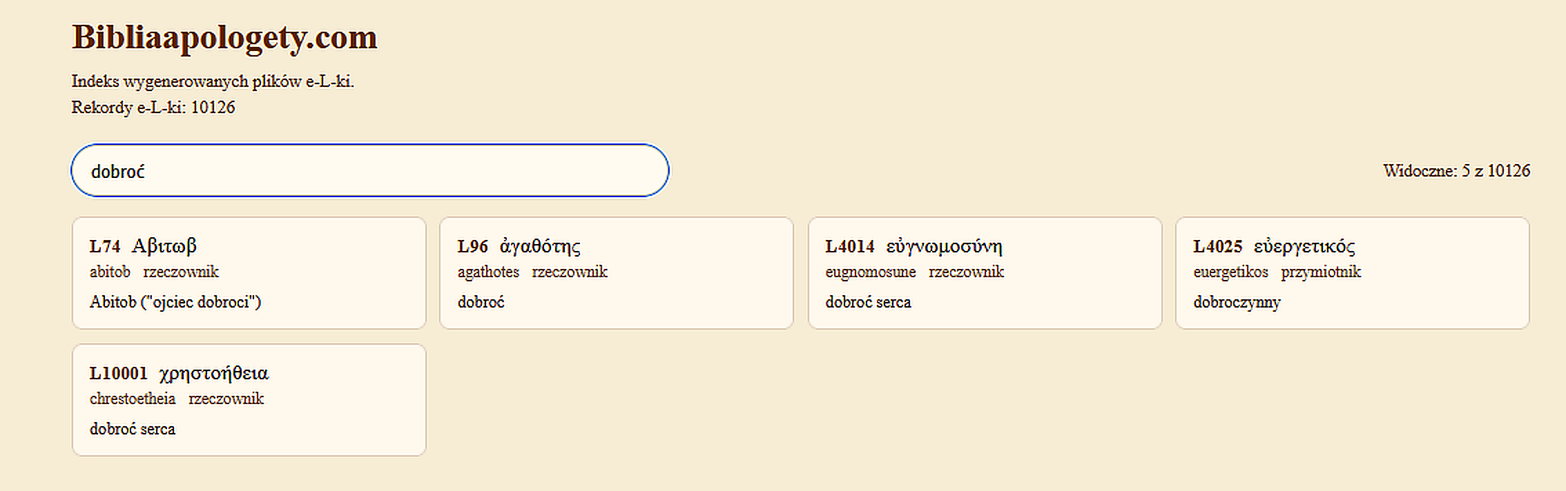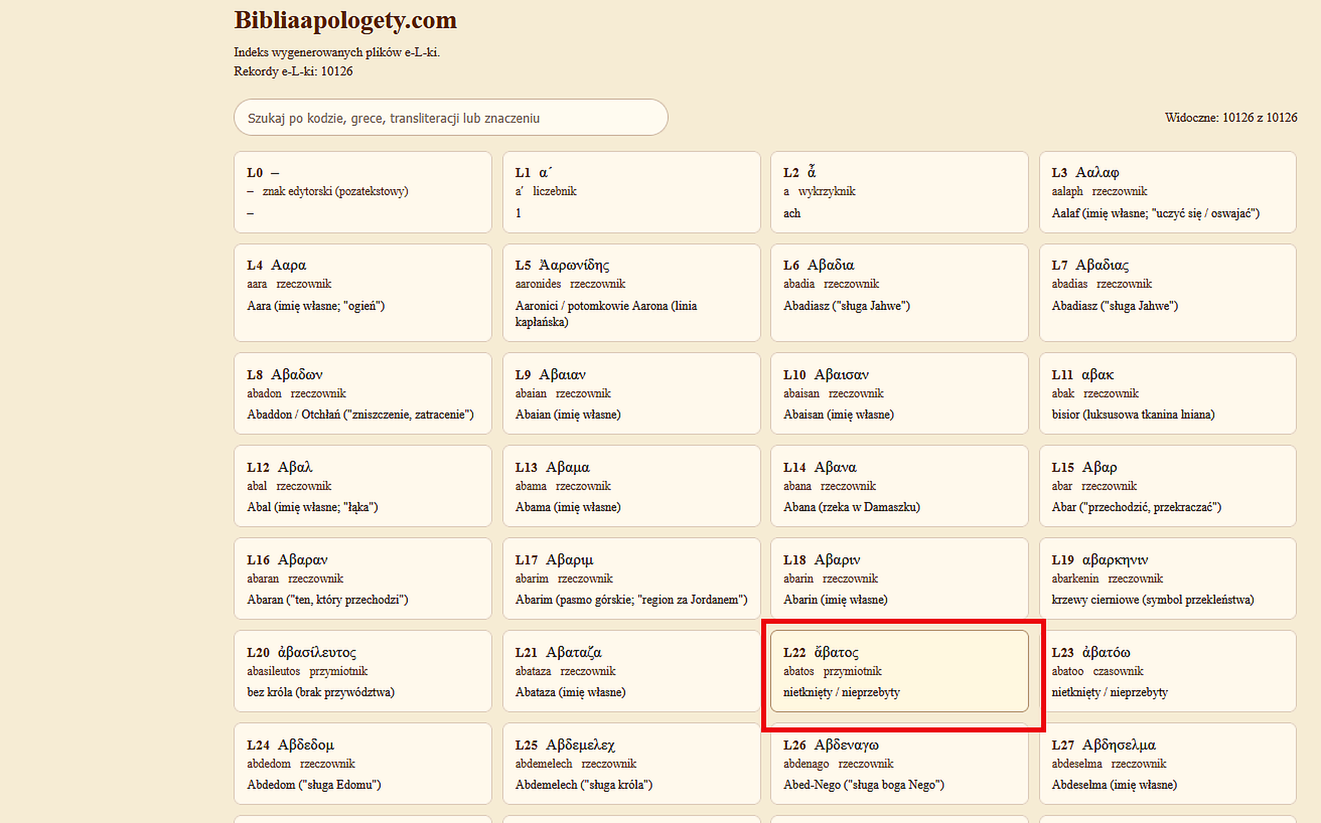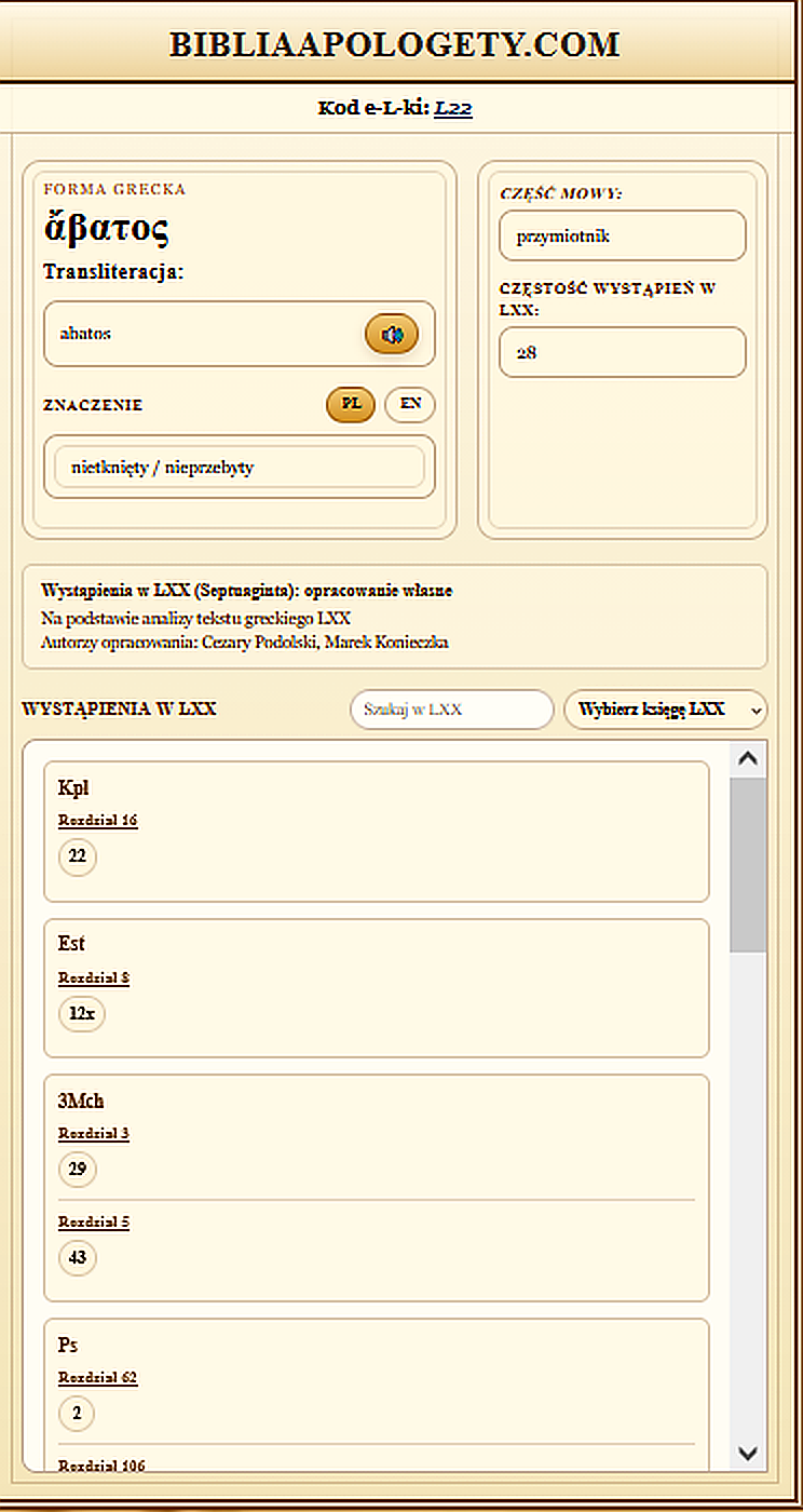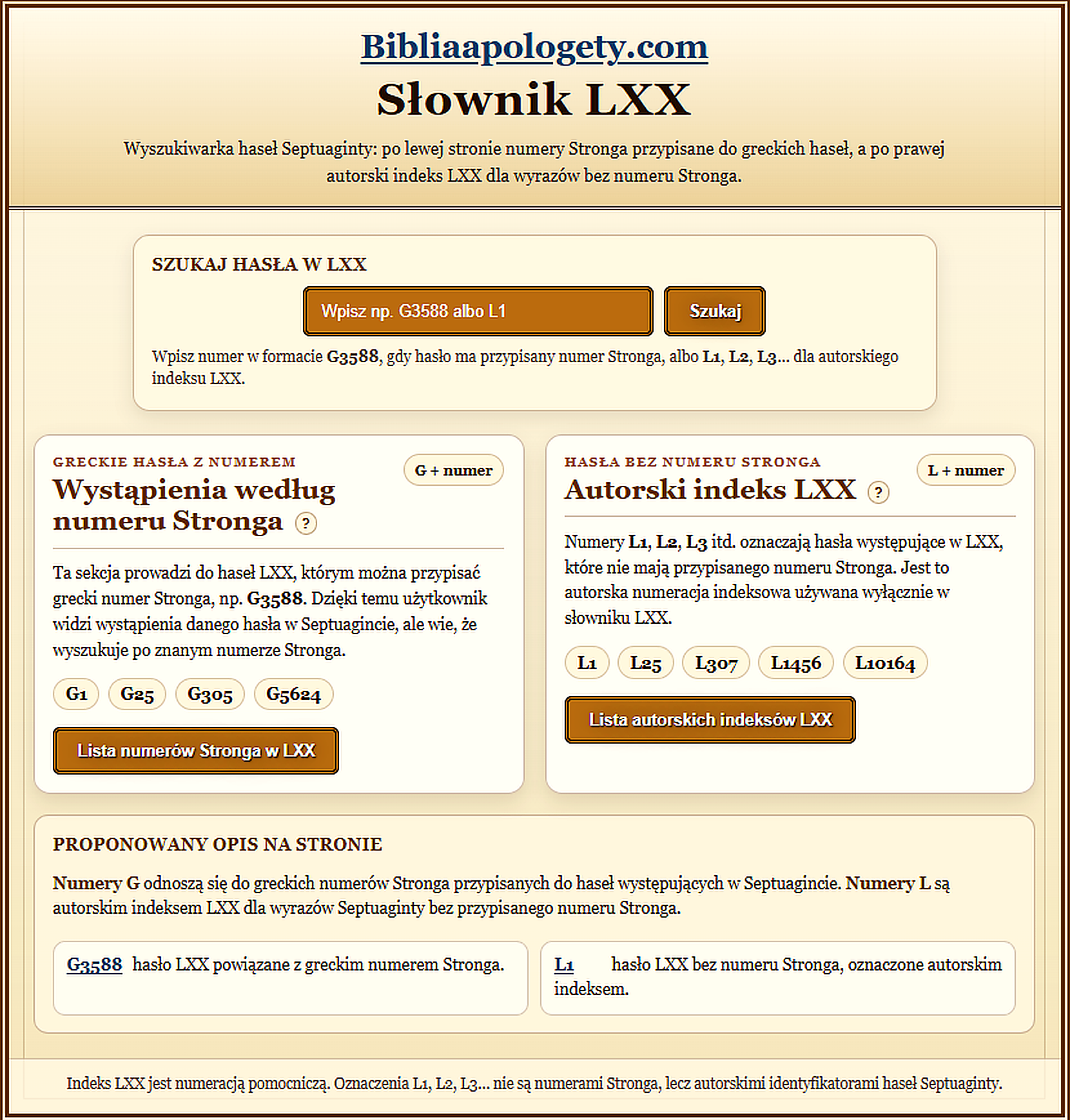 Słownik LXX to nowe, darmowe narzędzie, które pozwala przeszukiwać całość tekstu Septuaginty – zarówno poprzez numery Stronga, jak i dodatkowe oznaczenia „L”.