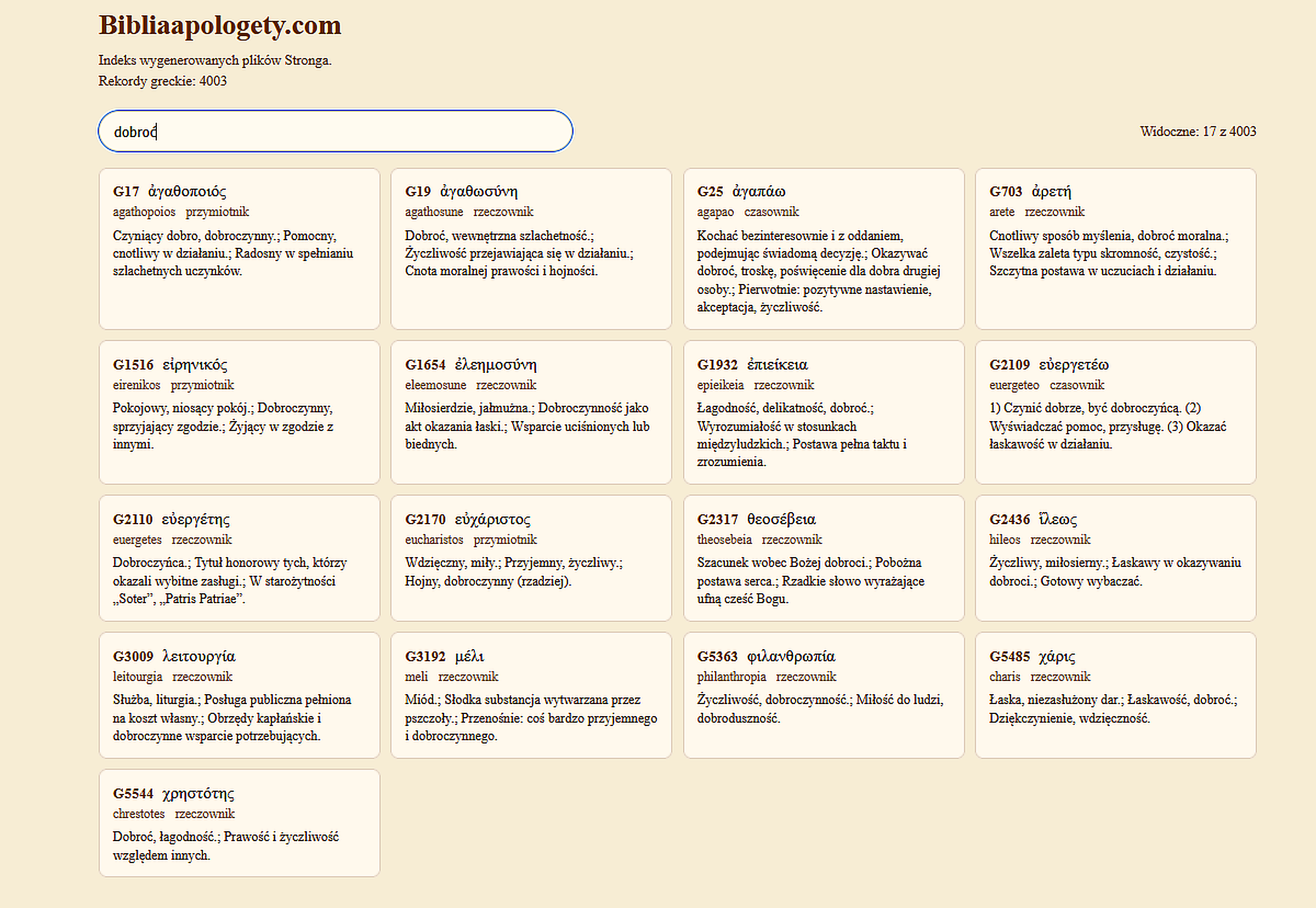 Wyszukiwarka haseł Septuaginty: po lewej stronie numery Stronga przypisane do greckich haseł, a po prawej autorski indeks LXX dla wyrazów bez numeru Stronga.