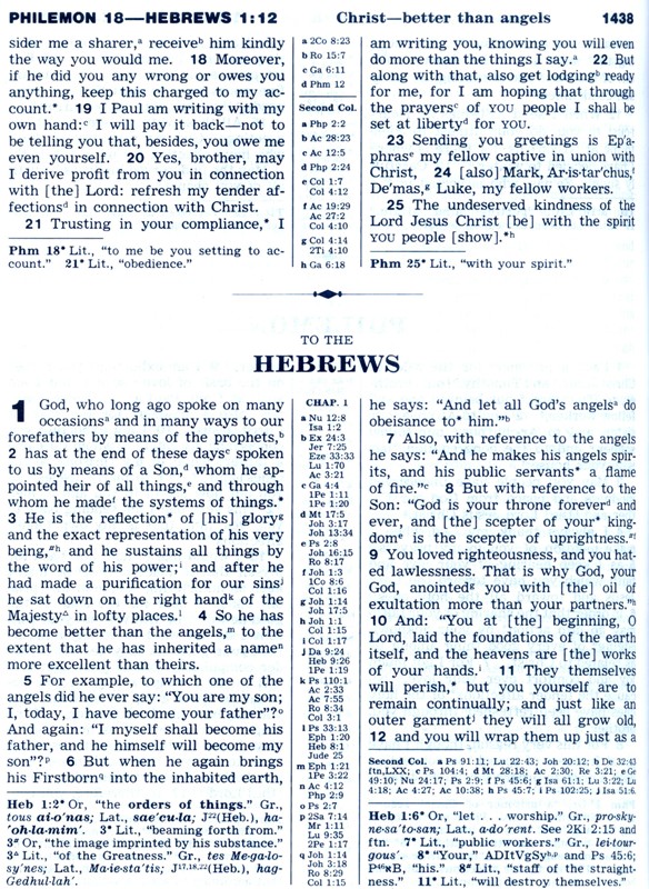 Jeszcze jeden aspekt dot. Hbr 1,10. Świadkowie Jehowy uzasadniając wprowadzenie słowa "Jehowa" do Nowego Testamentu w 237 miejscach w miejsce słowa kyrios, powołują się na hebrajskie przekłady Nowego Testamentu. W The Kingdom Interlinear Translation... (zob.) (wyd.1985) na str. 13, 14 i 15 podają daty powstania przekładów.
