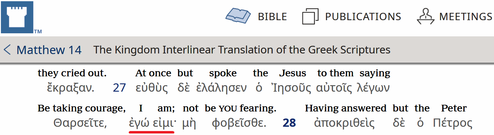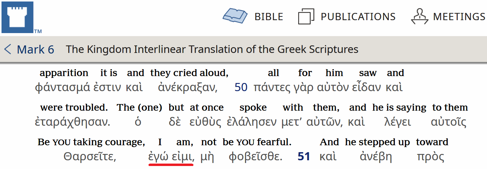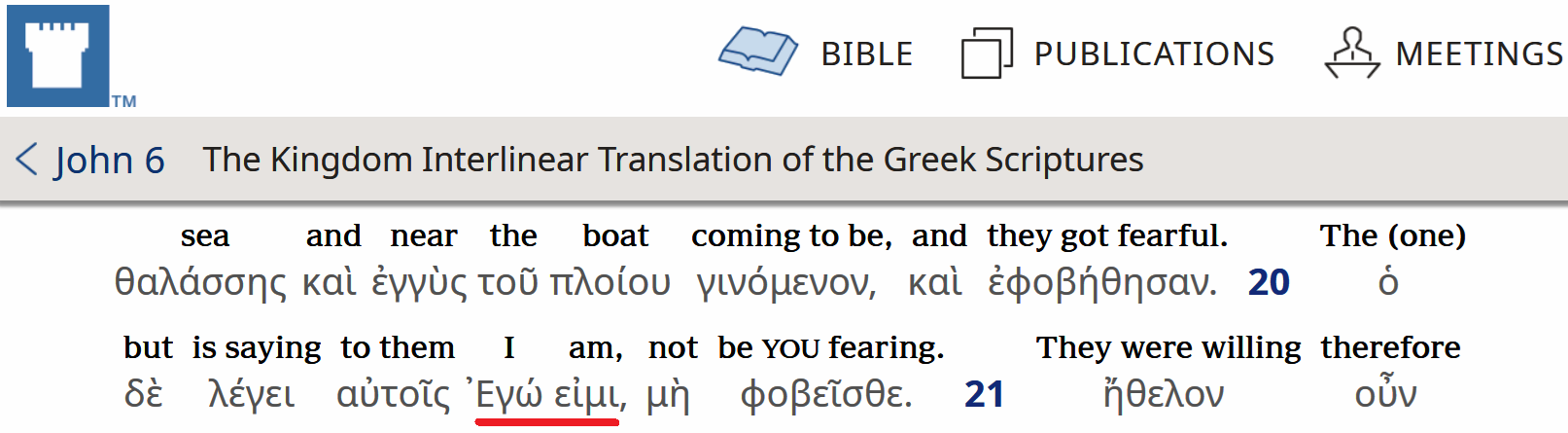 A więc sami Świadkowie Jehowy potwierdzają w swojej interlinii grecko-angielskiej, że w tekście greckim występuje fraza ἐγώ εἰμι· i tłumaczą "I am". Czy takie tłumaczenie nie jest skutkiem idoologicznej postawy, aby zwalczać Bóstwo Chrystusa. Przecież tłumacze doskonale wiedzą jak wygląda tekst w grece Nowego Testamentu. Widać to jak na dłoni w ich papierowej interlinii grecko-angielskiej, gdzie z lewej strony mamy dosłowne tłumaczenie na j. angielski, a w prawej szpalcie już angielski tekst Przekładu Nowego Świata, które służy jako "oryginał" do przekładów na inne języki nowożytne.