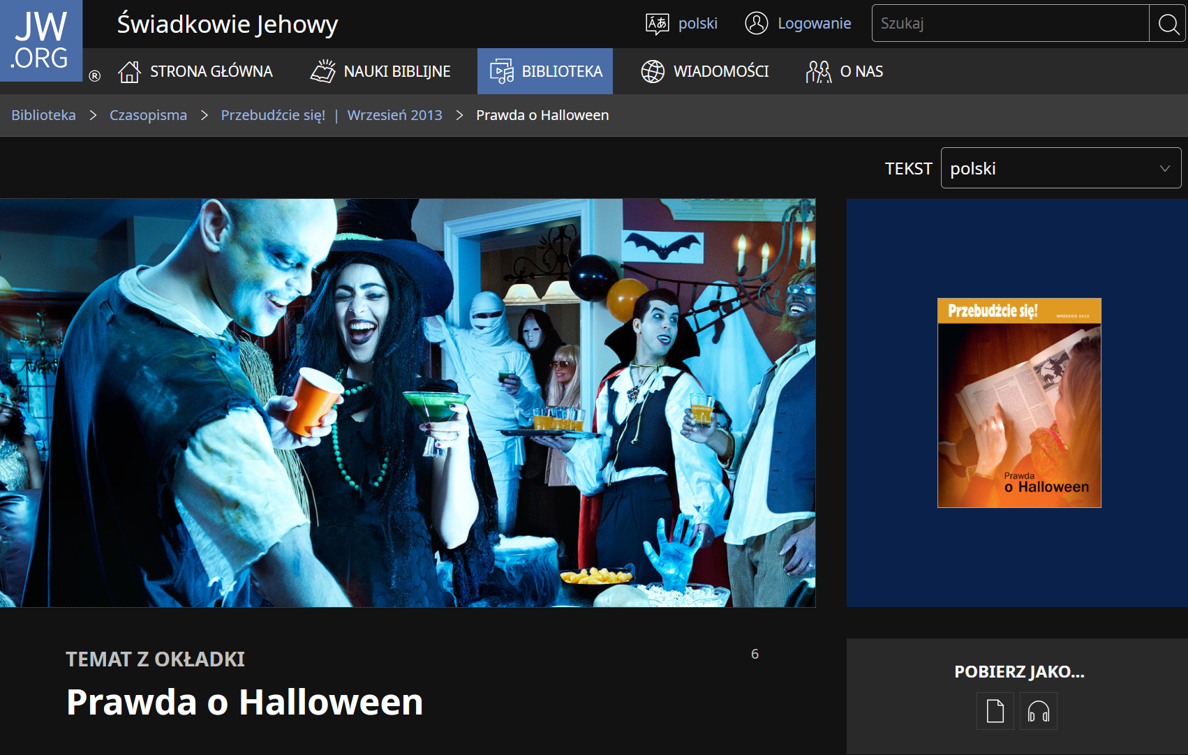 Na oficjalnej stronie internetowej Świadków Jehowy, pod zakładką "NAUKI BIBLIJNE" w temacie "Korzenie Halloween - co o tym mówi Biblia?":