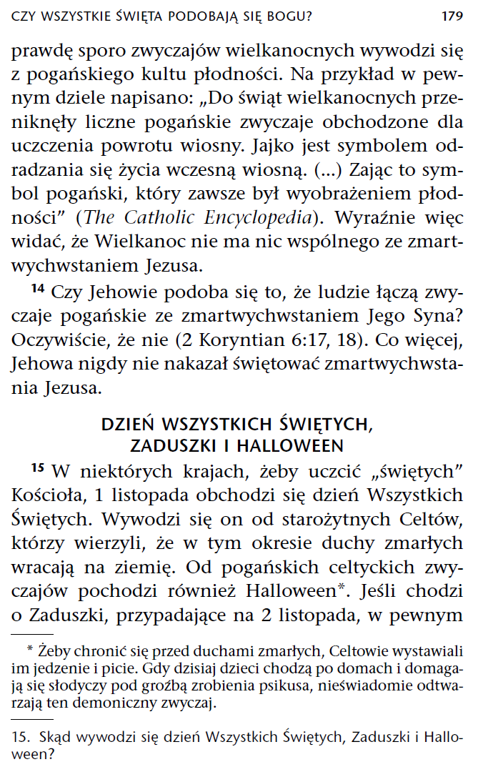 Słuszna uwaga, zgadzam się z nią. Te zwyczaje stoją w jawnej sprzeczności z Pismem Świętym. Należy jednak zadać też pytanie, dlaczego Świadkowie Jehowy zestawili Halloween z uroczystością Wszystkich Świętych i Dniem Zadusznym, skoro podczas obchodzenia tej uroczystości nie spotkałem, by kapłani odprawiający Mszę św. w kościołach czy na cmentarzach, uprawiali wróżby, gusła, przepowiednie i czary, uprawiali zaklęcia, pytali duchy i widma i zwracali się do umarłych?