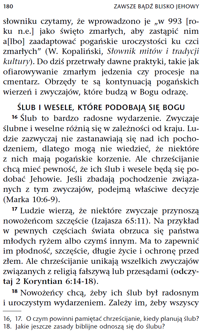 Jakie to konkretnie pogańskie zwyczaje Kościół połączył z obchodami Uroczystości Wszystkich Świętych i Zaduszek? Dlaczego Świadkowie Jehowy nie podają żadnych przykładów? Dlaczego łączą celtyckie praktyki zakładania przerażających masek z Uroczystością Wszystkich Świętych i Zaduszek? Co mają wspólnego odwiedziny domów jakiś przebierańców z omawianą Uroczystością Wszystkich Świętych i Zaduszkami? Czy Świadkom Jehowy nie pomyliło się w tym przypadku z odwiedzinami kolędników w okresie Bożego Narodzenia?.